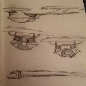 Making progress on the design of the Frontier-class, a modernised riff on the Excelsior refit. Plan is to build a 24″ model. Front elevation on the right is probably going to be close to final. October 5, 2014 trevor