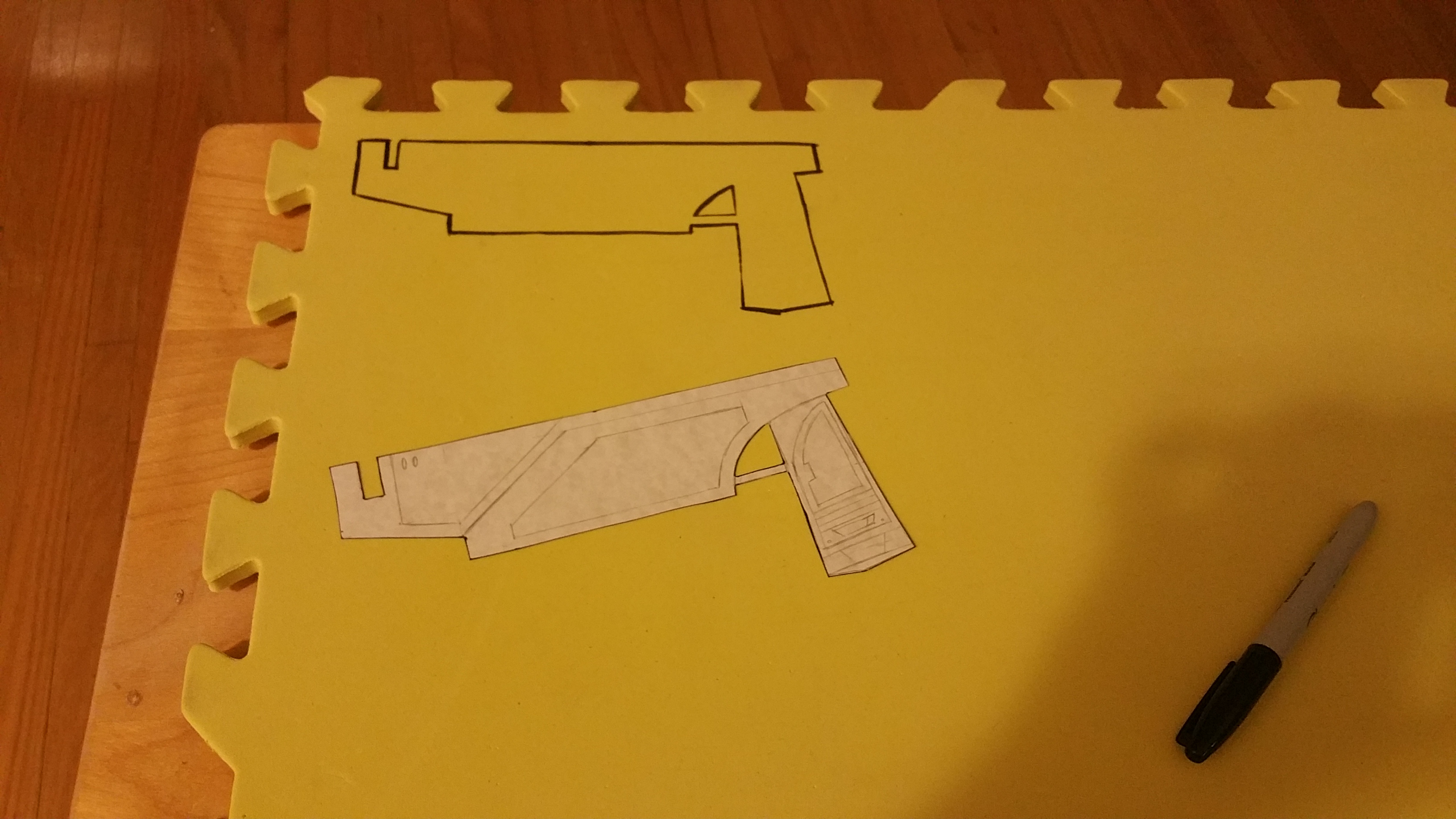 I started by cutting the body of the blaster to double the thickness of the foam. The EVA floor mats I bought were pretty thin – only 1 cm thick – and Sabine’s blasters are bulkier than that.